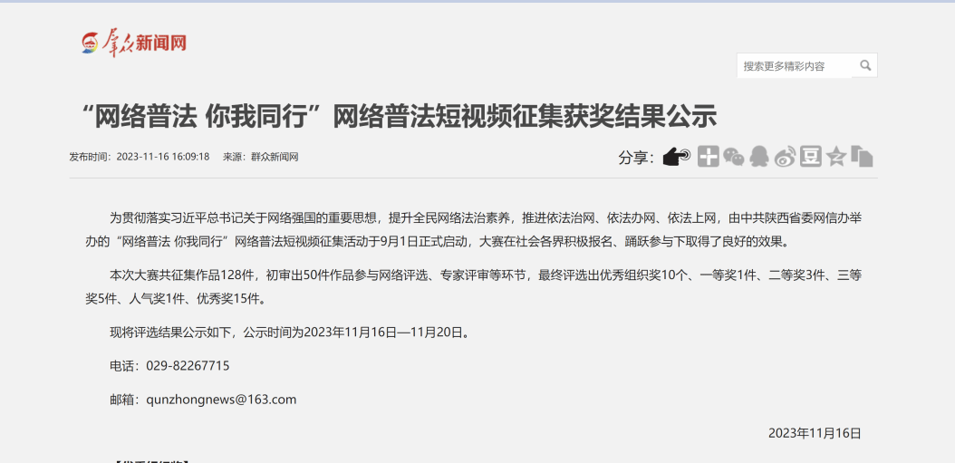 2023年9月1日,中共陕西省委网信办启动了“网络普法 你我同行”网络普法短视频征集活动。在学校宣传部的大力支持下,yl7703永利集团本科生的四组作品经遴选后参与本次征集活动。根据近日公布的评审结果,本科生王姿懿、周志伟、朱琳的参赛作品《算法西游》荣获本次比赛唯一的一等奖,yl7703永利集团荣获优秀组织奖。