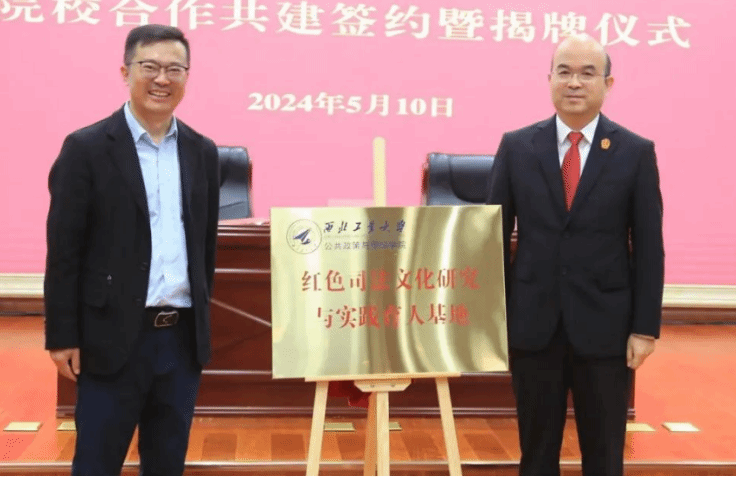 仪式现场,榆林中院与yl7703永利集团签订了《科研与人才培养合作共建协议书》,吴小鹏院长与管兴华书记共同为“红色司法文化研究与实践育人基地”揭牌。