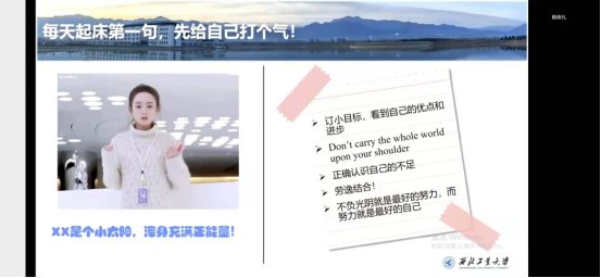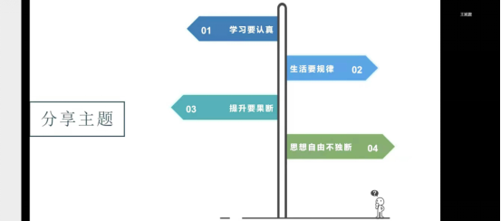 王旭震同学在分享的过程中给同学们提出了四点要求:一、学习要认真:良好的求知习惯从热爱知识开始,过程中相伴的是预习、学习、复习。二、生活要规律:懂得让生活变得规律,不要熬夜,坚持早起,热爱锻炼,给自己带来一个更好的精神状态。三、提升要果断:希望大家可以大胆尝试,拓展个人的兴趣面,提升个人的综合能力与心理见识。培养自己的判断力,学会接受和处理信息,能够保持思想定力。四、思想自由不断独立:人类有思想,这是最伟大的跨越。同时,自由的思想才会有创造力,希望大家能凭借自己的思想去大胆创新,大胆突破。