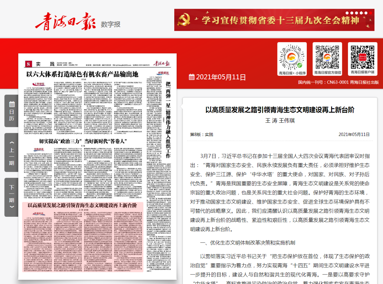 2021年两会期间,习近平总书记在参加青海代表团审议时强调,要坚定不移走高质量发展之路。yl7703永利集团法学系助理教授、全球治理国际研究中心执行主任王涛撰文《以高质量发展之路引领青海生态文明建设再上新台阶》进行理论解读和探讨,文章发表于5月11日《青海日报》第8版“学者声音”栏目。