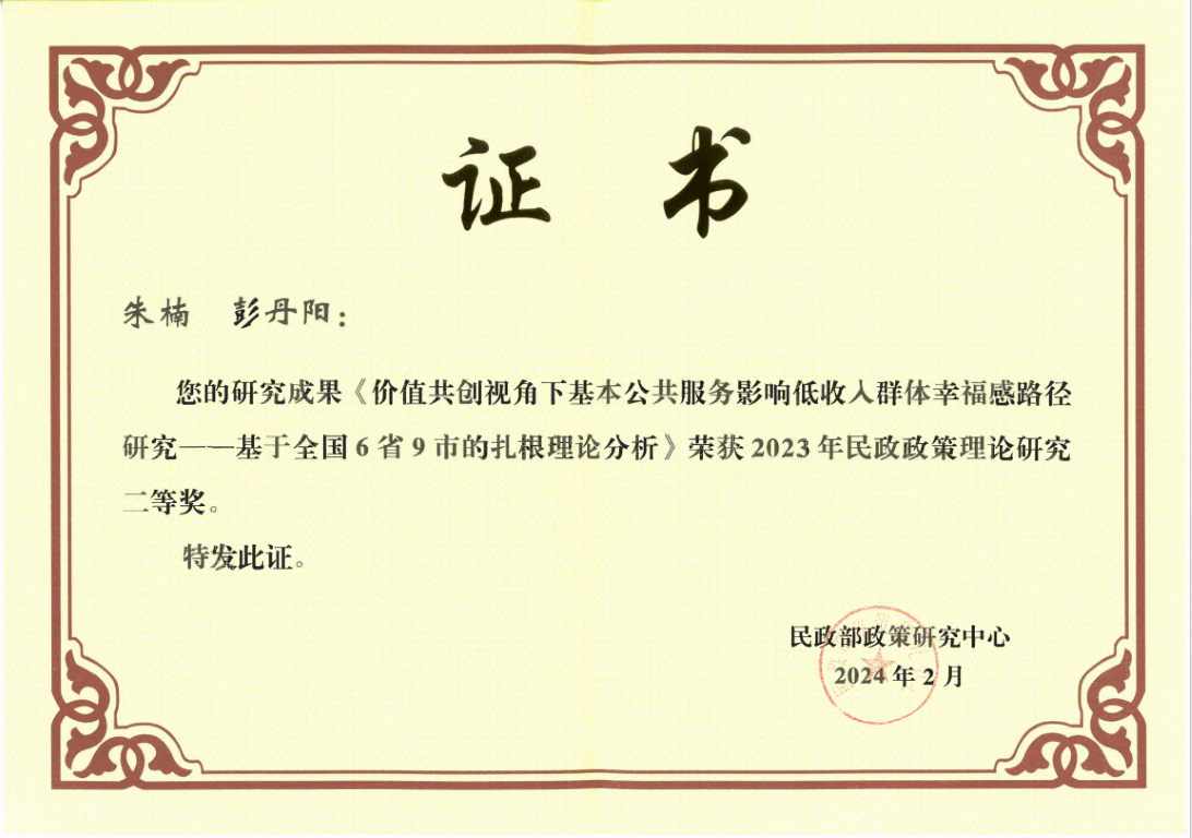 近日,yl7703永利集团公共管理系朱楠教授的学术论文《价值共创视角下基本公共服务影响低收群体幸福感路径研究——基于全国6省9市的扎根理论分析》获民政部2023年民政政策理论研究二等奖。