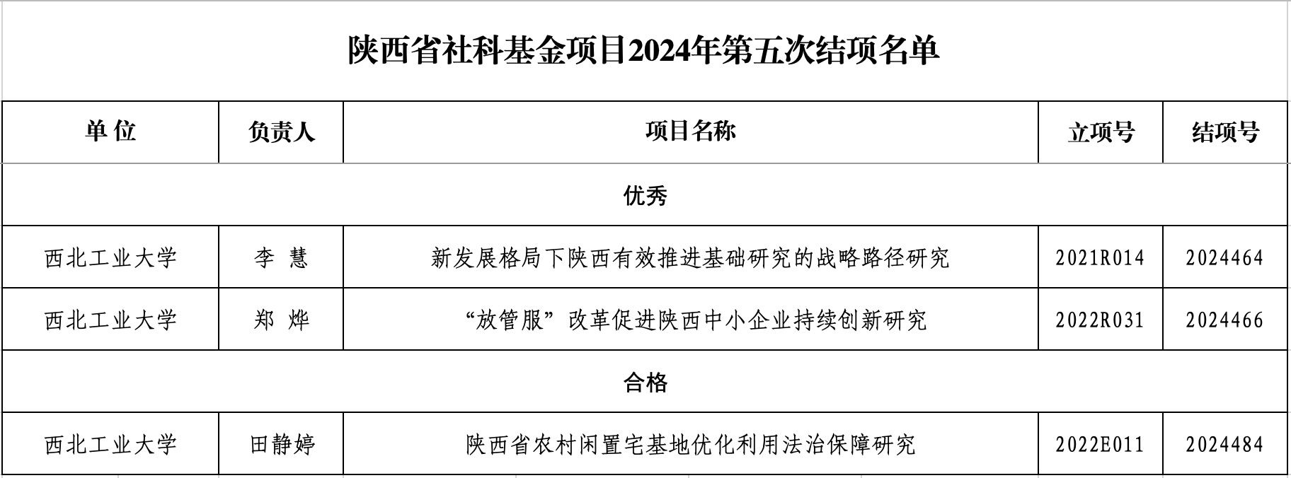 其中,李慧教授主持的《新发展格局下陕西有效推进基础研究的战略路径研究》(项目编号:2021R014)及郑烨副教授主持的《“放管服”改革促进陕西中小企业持续创新研究》(项目编号:2022R031)获结项“优秀”等级(本次全省共9项获得优秀)。