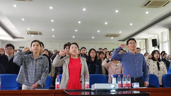 最后,学院党委副书记谢丹带领全体党员重温入党誓词,在高昂的誓言中,每一名党员高举右拳,面对党旗再一次对党作出庄严承诺。
