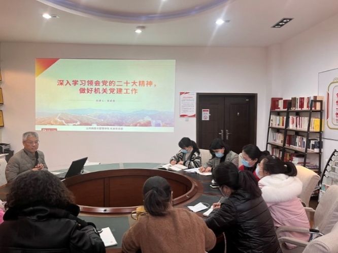 宋武伟以《深入学习领会党的二十大精神 做好机关党建工作》为题领学党的二十大报告。他号召党支部党员要把党的二十大精神转化为指导实践、推动工作的强大力量,以踔厉奋发、笃行不怠的精神面貌和求真务实、锐意进取的良好作风,创新思路、凝聚力量、埋头苦干、奋勇前进。他立足新时代党建工作总要求,强调机关党建要“走在前、作表率”、不断提升机关党建规范化水平,把党建切实融入学院中心工作,助推学院发展。