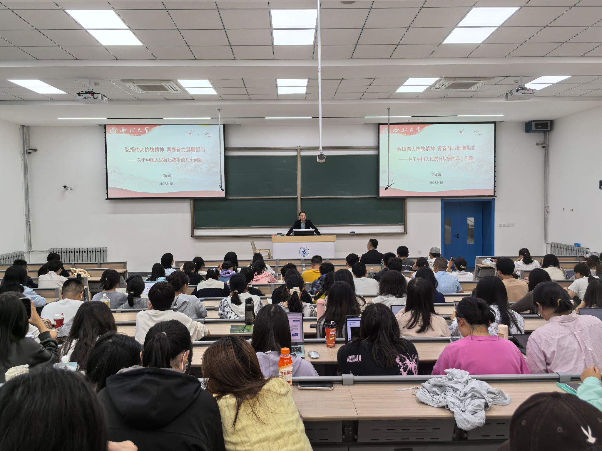 兰梁斌教授作题为“弘扬伟大抗战精神 青春奋力挺膺担当——关于中国人民抗日战争的几个问题”的专题报告,报告以纪念抗战胜利,弘扬抗战精神为主题,回顾了抗战胜利的意义及抗战胜利的关键因素,重点强调了坚持党的领导的重大意义,鼓励青年学生切实从抗战精神中汲取奋进力量,勇担民族复兴使命。