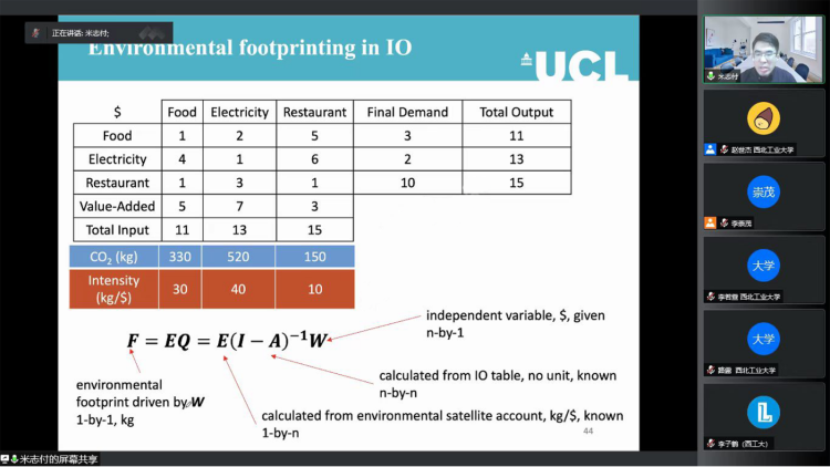 米志付博士是英国伦敦大学学院副教授、博导,担任国际学术期刊主编,研究方向为气候变化经济学,在Science子刊、Nature子刊等发表研究成果,多次受邀参加联合国可持续发展大会和联合国气候变化大会。本次研讨活动分享的主题是“Environmentally Extended Input-Output Analysis”。