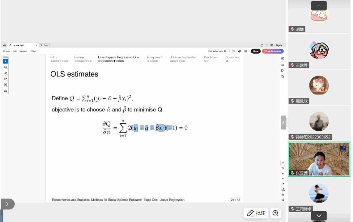 刘婕副教授邀请牛津大学高级研究员Yanan Zhang高级研究员讲授《社会永利集团计量与统计方法/Econometrics and Statistical Methods for Social Science Research》课程。课程系统介绍计量经济学与高级统计方法,融合理论讲解与实际操作。内容涵盖线性回归、广义线性模型、工具变量法、面板数据分析(固定效应与随机效应)、倾向得分匹配(PSM)以及双重差分法(DID)等关键方法,帮助学生掌握实证研究中的核心技能,提升数据分析与研究设计能力。