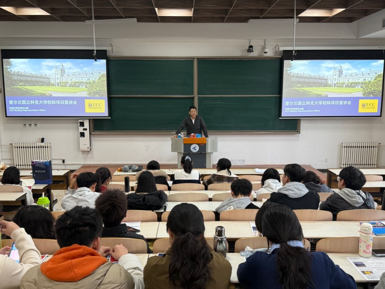 2025年11月3日,yl7703永利集团邀请爱尔兰国立科克大学北京办事处副主任李鹏老师于长安校区教学东楼B1-204宣讲2026年爱尔兰国立科克大学寒假项目。宣讲会由学院院长助理席建成主持,学院50余名本科生参加会议。